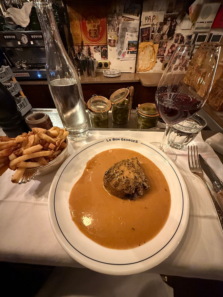 This place is a scene, and it is expensive, but they have a phenomenal wine list and delicious food so it’s genuinely worth the hype. The steak au poivre is amazing, in spite of the waitress telling me, “bah you want the instagram dinner.“ Generally, most bistros I’ve been to in Paris have good wine, it’s France after all, but Le Bon Georges has bona fides as having the best wine list in France.